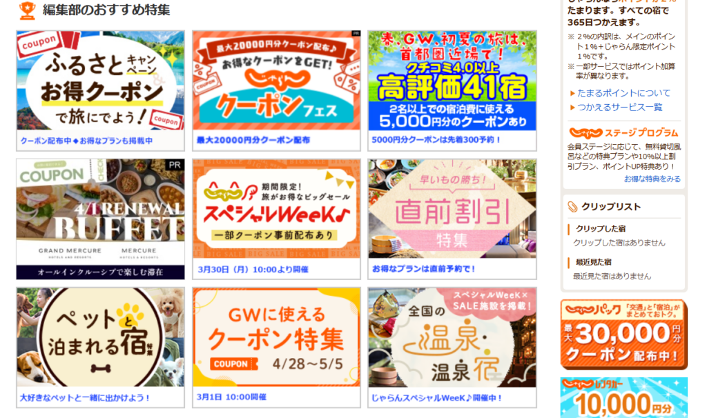 掲載宿数も多く、幅広い価格帯から選べるため、コスパ重視の方にも人気があります。また、セールやキャンペーンも頻繁に実施されており、タイミング次第ではかなりお得に予約することが可能です。