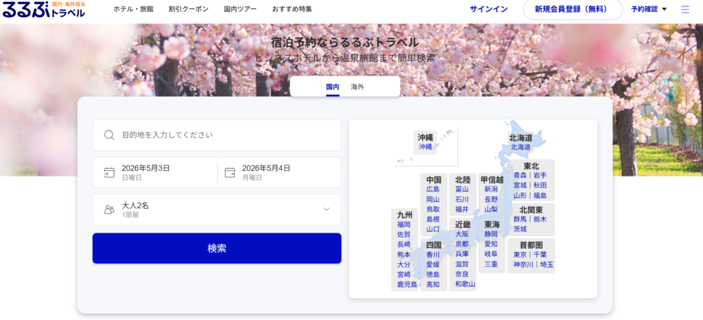 るるぶトラベルは、観光情報と連動した宿選びができるのが特徴のサービスです。旅行ガイドで培われた情報力を活かし、観光地と合わせて宿を探せる点が魅力です。