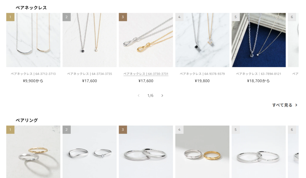 価格帯も比較的手頃で、日常的に使えるペアアクセを探している方に向いています。デザインは控えめながらも洗練されており、長く使えるアイテムが多いのが特徴です。